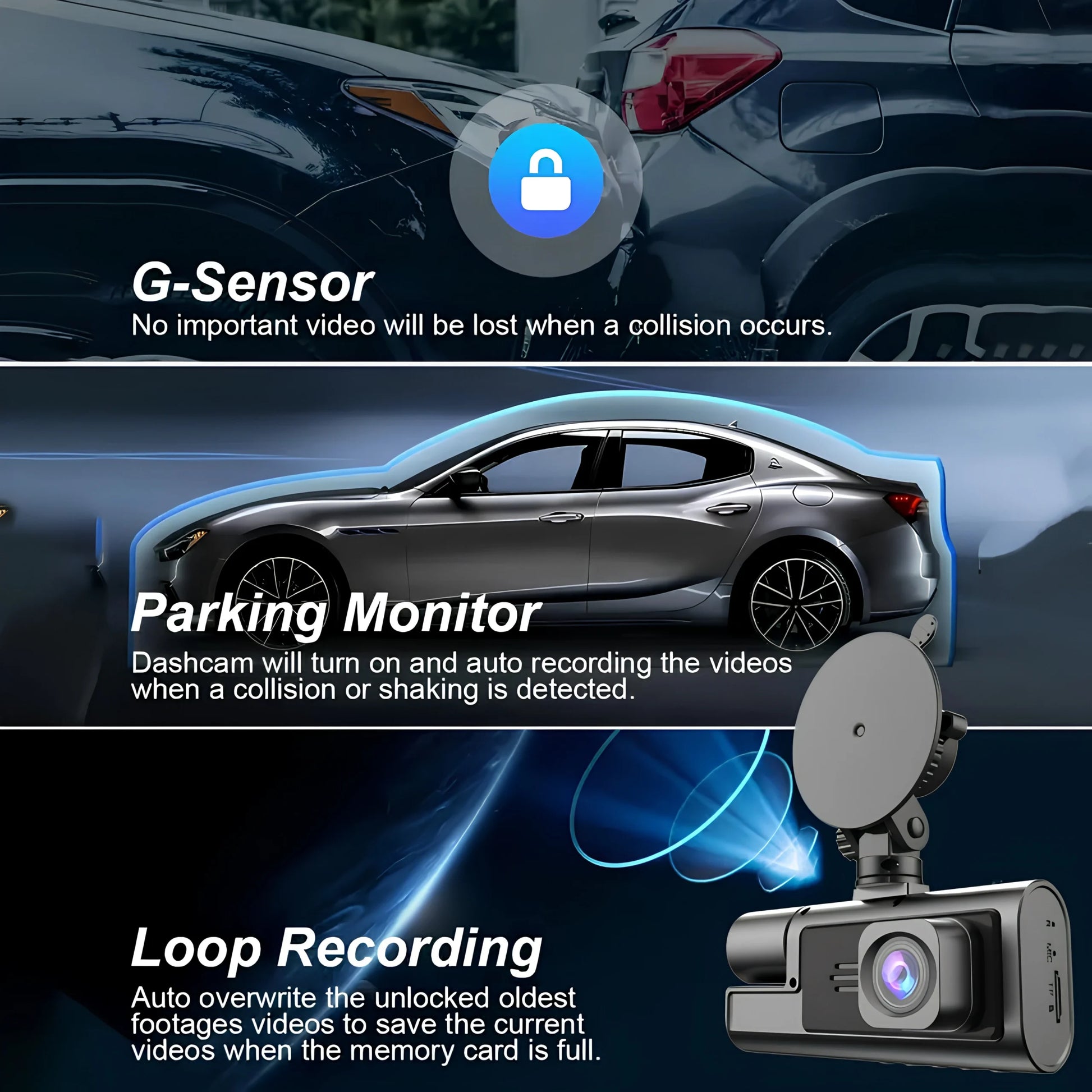 -📹 Vigilancia completa: Captura cada momento con nuestra cámara de carro HD de 3 canales, cubriendo el frente, interior y parte trasera de tu vehículo.